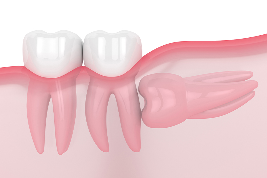 親知らずが横を向いて埋まっていて隣の歯が虫歯になったり、清掃性が悪いために炎症を起こして腫れてしまうリスクが高いため、抜歯をした方が良いケースです。親知らずと神経が近い場合は、安全のためにCT撮影をして位置関係を確認します。